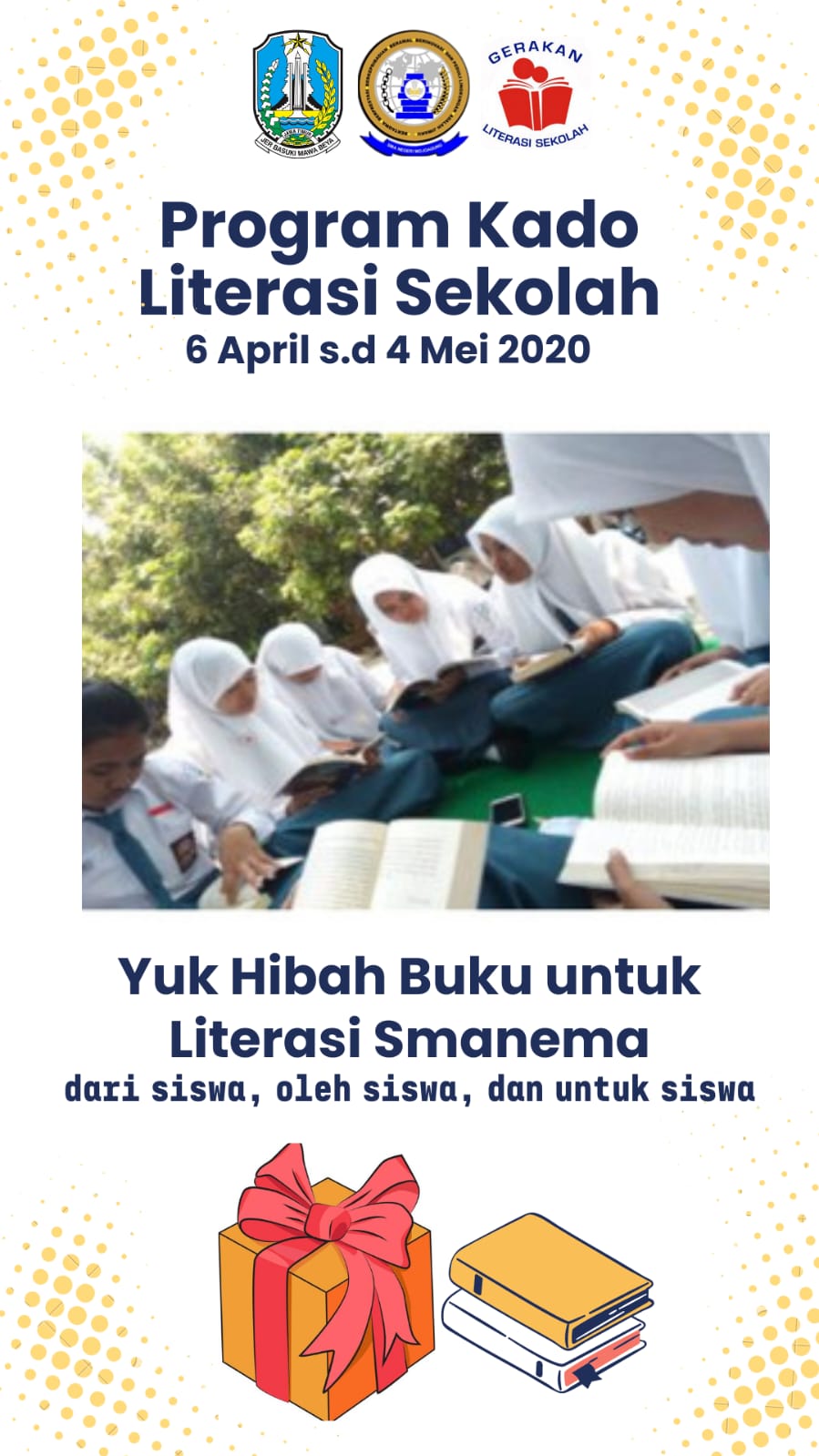 Tim pegiat literasi SMA Negeri Mojoagung mengajak seluruh siswa kelas XII menikmati masa kelulusan dari bangku SMA, dengan beramal dan memberi kenangan terindah pada seluruh generasi SMA Negeri Mojoagung. Kegiatan bertajuk KADO LITERASI SEKOLAH ini dilaksanakan dalam bentuk kegiatan hibah buku dari siswa, oleh siswa, dan untuk siswa.